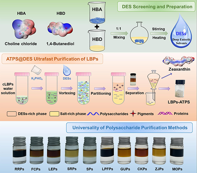 高效、精準(zhǔn)的分離純化是開展多糖精細(xì)結(jié)構(gòu)解析和活性研究的重大難題,而樣品前處理是多糖分離純化的重要基礎(chǔ)和前提。傳統(tǒng)多糖分離純化的樣品前處理技術(shù)包括脫脂、脫蛋白和脫色等過(guò)程,不僅操作繁雜、時(shí)間冗長(zhǎng),而且會(huì)導(dǎo)致多糖流失、結(jié)構(gòu)變化和活性失活等。針對(duì)上述問(wèn)題,課題組提出了將低共熔溶劑(Deep Eutectic Solvents,DES)引入雙水相體系(Aqueous Two-Phase System,ATPS)的新思路,構(gòu)建了新型ATPS@DES多糖樣品前處理新體系,實(shí)現(xiàn)了枸杞多糖同步脫脂、脫蛋白和脫色;同時(shí),在此溫和、綠色的條件下,實(shí)現(xiàn)了枸杞多糖高保留率和最大程度保持多糖的原始結(jié)構(gòu)特征。