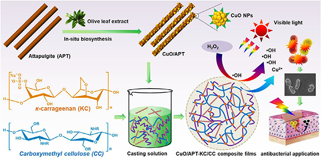 圖4.CuO/APT-KC/CC凝膠膜敷料的制備和抗菌應用示意圖