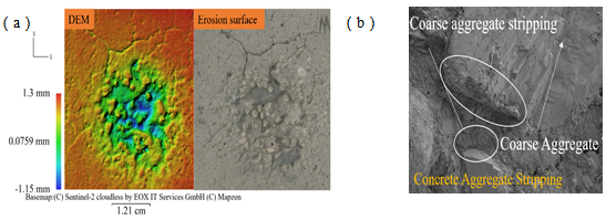 風(fēng)沙流速為30 m/s,風(fēng)沙攻角為90°,磨蝕時間為8 min時混凝土磨蝕試件的微觀形貌分析:(a)運動結(jié)構(gòu)重建(SfM)獲得三維表面形態(tài);(b)掃描電鏡(SEM)二維表面分析