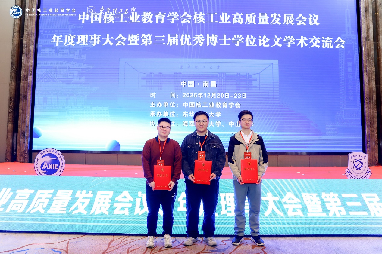 會議公布了中國核工業(yè)教育學會第三屆全國優(yōu)秀博士學位論文獲獎結果,2025屆博士生寇維的學位論文《核子內部結構和QCD非微擾性質若干研究》榮獲優(yōu)秀博士學位論文二等獎,2025屆博士生趙世偉的學位論文《SiC功率器件結構對其單粒子效應的影響機理研究》、2024屆博士生成釗意的學位論文《面向核能的FeCrV系中熵合金熱學、力學及抗輻照性能研究》榮獲優(yōu)秀博士學位論文三等獎,陳旭榮研究員、劉杰研究員和孫建榮研究員獲得優(yōu)秀指導教師稱號。此外,近代物理所與四川大學聯(lián)合培養(yǎng)博士生黃宇的論文榮獲優(yōu)秀博士學位論文一等獎。