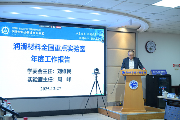 蘭州化物所所長、實驗室主任周峰研究員作了2025年度工作報告,全面梳理科研成果、平臺建設(shè)、人才引育、產(chǎn)業(yè)化等領(lǐng)域的成效,深入剖析現(xiàn)存問題與改進(jìn)思路,明確2026年工作重點與核心發(fā)展目標(biāo)。蔡美榮研究員、鮑路瑤副研究員、龔珍彬副研究員分別作了“固/介質(zhì)復(fù)合潤滑材料的空間環(huán)境效應(yīng)及在軌驗證研究”“潤滑油材料的高通量計算和人工智能設(shè)計”“折疊石墨烯量子摩擦與能量耗散機制”的學(xué)術(shù)報告。