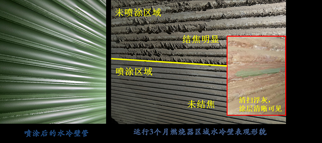 噴涂防護材料的受熱面就像穿了一件“鋼鐵鎧甲”,阻隔了外部腐蝕介質(zhì)的侵入,減少了鍋爐高溫煙氣中熔融物對管壁的黏附,保護水冷管壁表面不受結焦、高溫腐蝕的影響;并且涂層與基材具有匹配的導熱率和熱膨脹系數,不影響鍋爐的傳熱效率以及使用壽命。同時(shí),防護材料還具有的紅外輻射功效,可強化爐膛內輻射傳熱,降低爐膛出口煙溫;強化燃燒,提高煤粉的燃盡率,降低煤耗、提高煤種的適應性。