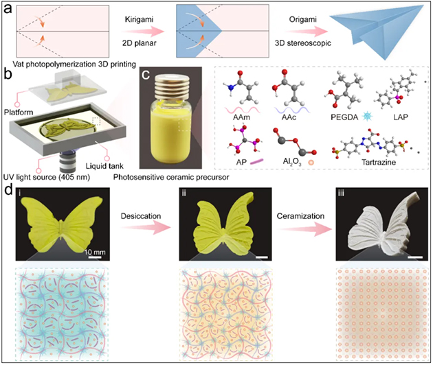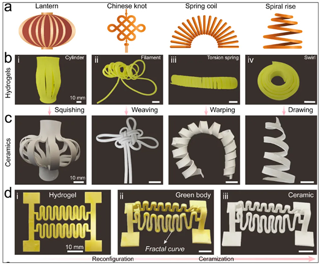 受剪紙藝術(shù)以及智能材料的啟發(fā),研究人員想到,柔性水凝膠就是一種具有一定可變形性的材料,它能在加工或使用過(guò)程中展現出多樣化的性能。那么,能不能使陶瓷結合這種材料特性,像剪紙一樣“裁”成我們需要的形狀呢?