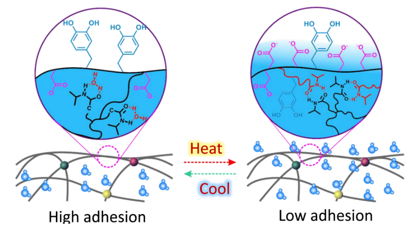 這項突破并非一蹴而就。周峰回憶,幾年前,團隊一直攻關(guān)高強韌黏附水凝膠材料,偶然發(fā)現一種材料在多次按壓后黏性驟降?!霸摤F象引發(fā)了我們的極大興趣,經(jīng)過(guò)對材料的成分分析、機理驗證等,才知道原來(lái)在多次按壓以后,手部溫度傳遞到凝膠表面,致使凝膠發(fā)生相變,呈現低黏附態(tài)?!边@讓團隊意識到,溫度可能是調控黏附性能的鑰匙。
