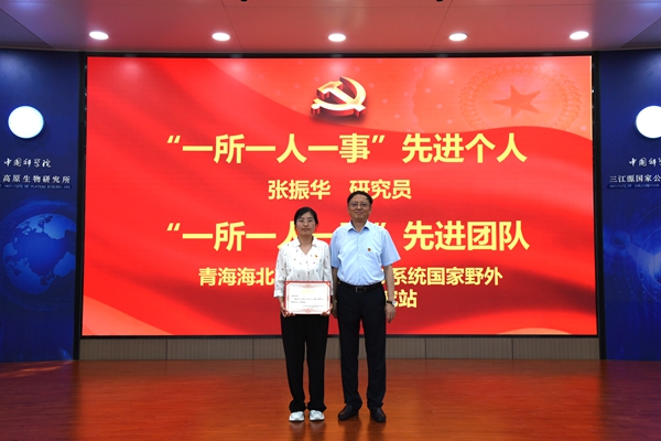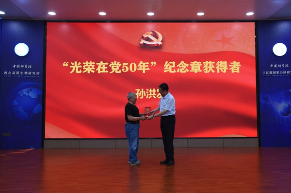 會(huì )議第二階段,在雄壯的國歌聲中,西北高原所召開(kāi)慶祝建黨103周年表彰大會(huì )。楊勇剛宣讀了《中共中國科學(xué)院西北高原生物研究所委員會(huì )關(guān)于表彰先進(jìn)黨支部、優(yōu)秀共產(chǎn)黨員和優(yōu)秀黨務(wù)工作者的決定》。首先,所長(cháng)陳世龍向孫洪發(fā)同志頒發(fā)“光榮在黨50年”紀念章,代表所黨委向孫洪發(fā)同志表示祝賀,并對他多年來(lái)為黨的事業(yè)盡心竭力、無(wú)私奉獻致以崇高的敬意。