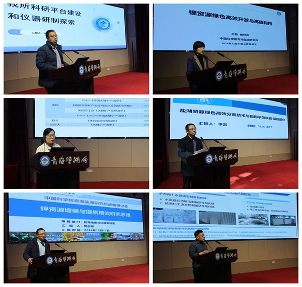 大會(huì )開(kāi)始,鄭詩(shī)禮副所長(cháng)(主持工作)首先介紹了召開(kāi)此次戰略研討會(huì )的背景和意義。隨后,李武研究員、樊啟順研究員、王敏研究員、葉秀深研究員、劉海寧研究員及副所長(cháng)馮海濤研究員圍繞鹽湖化學(xué)基礎研究、鉀資源增儲、鋰高效分離、鎂基結構材料、鹽湖稀散元素和儀器設備平臺開(kāi)發(fā)六個(gè)方向分別以《鹽湖資源綠色高效分離技術(shù)與應用示范項目-基礎部分》《鉀資源增儲與提質(zhì)增效研究思路》《鋰資源綠色高效開(kāi)發(fā)與高值利用》《強化關(guān)鍵科學(xué)與技術(shù)攻關(guān)加快推動(dòng)鹽湖鎂產(chǎn)業(yè)多元化高值化發(fā)展》《鹽湖銣銫溴碘硼高值元素資源增儲與分離提取》《青海鹽湖所科研平臺建設與儀器研制探索》為題作報告。