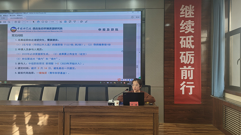 為落實(shí)蘭州分院與甘肅省科學(xué)院會(huì )商會(huì )議精神,幫助甘肅省科學(xué)院提升基金項目申報的水平和質(zhì)量,1月11日,蘭州分院與甘肅省科學(xué)院共同舉辦了國家自然科學(xué)基金申報培訓會(huì )。會(huì )議特邀西北生態(tài)環(huán)境資源研究院研究員、國家自然科學(xué)基金杰出青年基金獲得者趙文智,西北生態(tài)環(huán)境資源研究院科研管理處牛麗博士交流分享基金申報和管理經(jīng)驗。蘭州分院科技合作處、甘肅省科學(xué)院科研處、甘肅省科學(xué)院所屬研究所科研代表共計60余人參加會(huì )議。