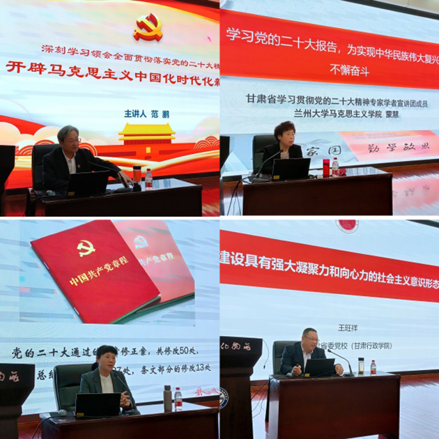 中共甘肅省委黨校文史教研部主任王旺祥教授,甘肅省委專(zhuān)家學(xué)者宣講團成員、中共甘肅省委黨校黨的建設與領(lǐng)導科學(xué)教研部主任高璐佳,甘肅省學(xué)習貫徹黨的二十大精神專(zhuān)家學(xué)者宣講團成員、蘭州大學(xué)馬克思主義學(xué)院蒙慧教授,甘肅省委專(zhuān)家學(xué)者宣講團成員、蘭州大學(xué)范鵬教授分別應邀作了題為“建設具有強大凝聚力和向心力的社會(huì )主義意識形態(tài)”“黨的二十大黨章修改的重點(diǎn)內容及其重大深遠歷史意義”“學(xué)習黨的二十大報告,為實(shí)現中華民族偉大復興不懈奮斗”“深刻學(xué)習領(lǐng)會(huì )全面貫徹落實(shí)黨的二十大精神 開(kāi)辟馬克思主義中國化時(shí)代化新境界”的報告。