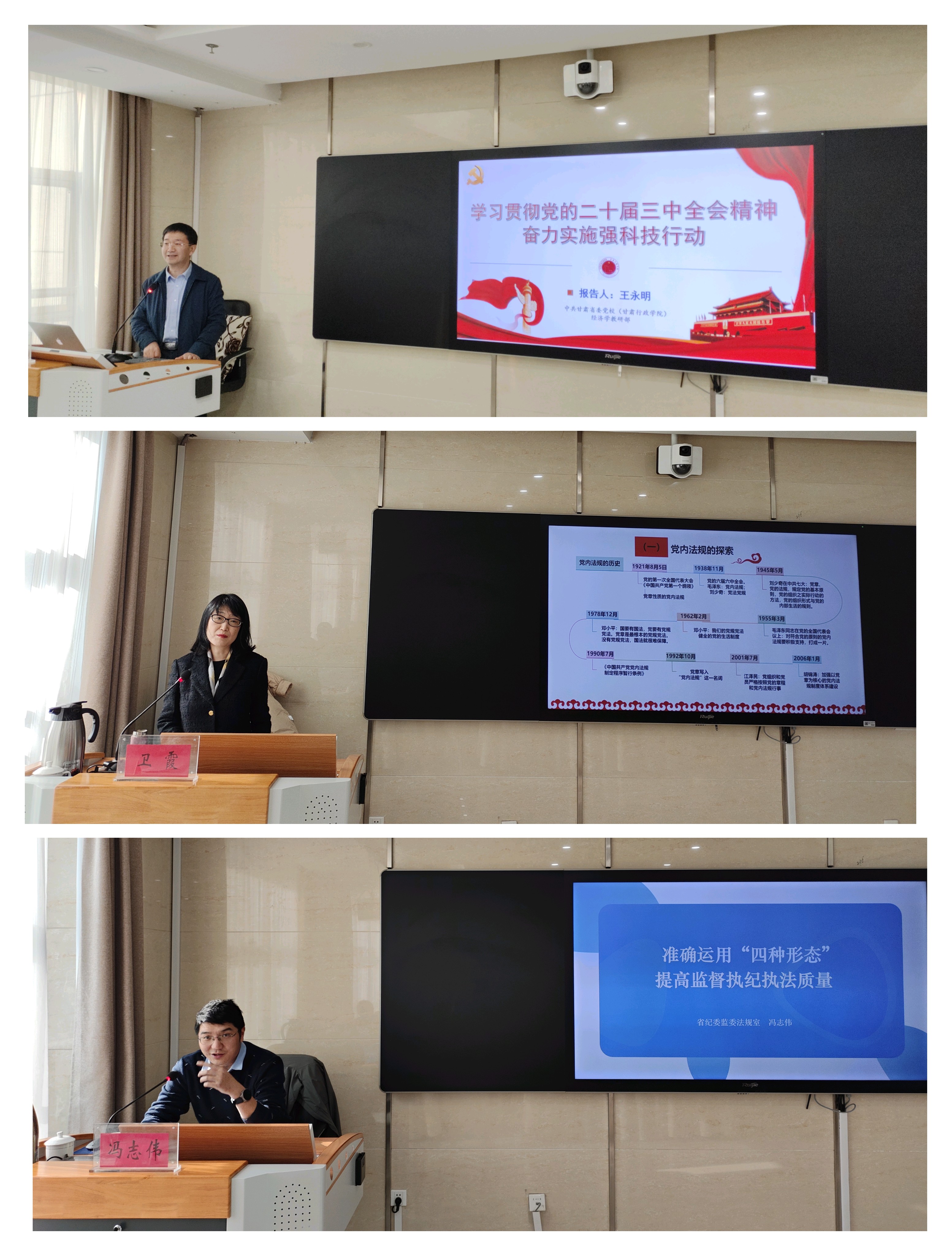 此次培訓結合工作實(shí)際設置了三場(chǎng)專(zhuān)題報告、三場(chǎng)經(jīng)驗分享和兩次警示教育。中共甘肅省委黨校(甘肅行政學(xué)院)王永明副教授和衛霞教授,分別作題為《學(xué)習貫徹黨的二十屆三中全會(huì )精神 奮力實(shí)施強科技行動(dòng)》和《監督執紀相關(guān)黨內法規解讀》專(zhuān)題報告;甘肅省紀委監委法規室馮志偉作題為《準確運用監督執紀“四種形態(tài)”》專(zhuān)題報告。