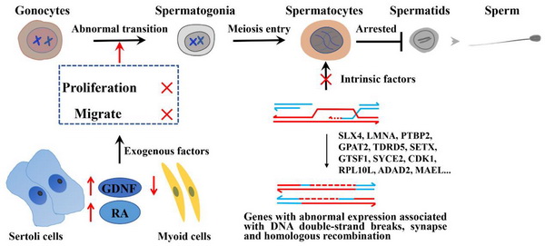 以上研究通過(guò)描繪牦牛生殖細胞和睪丸體細胞內外源因子的表達圖譜,為系統解析牛屬動(dòng)物正常精子發(fā)生提供了重要數據,通過(guò)對比分析,發(fā)現犏牛精原細胞形成異常和減數分裂缺陷是導致其不育的兩個(gè)原因。本研究發(fā)現的參與DNA雙鏈斷裂、聯(lián)會(huì )和同源重組等減數分裂關(guān)鍵事件的蛋白質(zhì),為犏牛雄性不育機制解析和遺傳矯正策略研究奠定了基礎。
