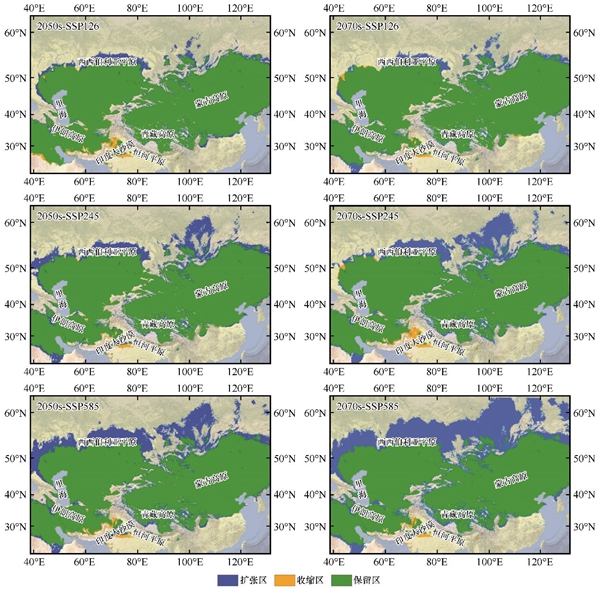 中國科學(xué)院西北生態(tài)環(huán)境資源研究院(以下簡(jiǎn)稱(chēng)西北研究院)趙鵬善研究員團隊利用沙蓬屬(Agriophyllum)5個(gè)物種的分布點(diǎn)數據和9種環(huán)境變量數據,模擬沙蓬屬當前及未來(lái)兩個(gè)時(shí)期(2050s和2070s)不同氣候情景下的潛在分布。采用刀切法篩選關(guān)鍵環(huán)境因子,kuenm數據包優(yōu)化模型參數,最后預測分析了未來(lái)沙蓬屬物種適生區的空間變化。研究發(fā)現:(1)MaxEnt模型預測沙蓬屬潛在分布的精度高,AUC值為0.957±0.006,當前總適生區的面積為1 731.50萬(wàn)km2,其中高適生區面積為462.35萬(wàn)km2,沙蓬屬可廣泛分布在亞洲中緯度干旱和半干旱地區;(2)在未來(lái)氣候變化情景下,沙蓬屬潛在適生區有向高緯度和高海拔地區擴張的趨勢(圖1);(3)溫度是影響沙蓬屬物種分布的主導環(huán)境因子。
