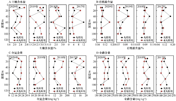 中國科學(xué)院西北生態(tài)環(huán)境資源研究院(以下簡(jiǎn)稱(chēng)西北研究院)司建華研究員團隊以阿拉善左旗騰格里沙漠飛播區為研究區,采用空間替代時(shí)間方法,對比分析了2017—2020年種子丸?;臀赐枇;w播區植被生長(cháng)狀況、土壤水分、養分和土壤微生物的變化情況。研究發(fā)現:(1)飛播種子丸?;夹g(shù)應用后,丸?;^植物蓋度及地上、地下和總生物量分別以13.72%、395.88%、127.97%和526.16%的年增長(cháng)率增加;未丸?;^各項指標增量明顯低于丸?;^;(2)每個(gè)飛播年丸?;臀赐枇;^土壤含水量和養分之間差異性不明顯;隨著(zhù)生長(cháng)年限增加,土壤有機碳呈增加趨勢,土壤全氮含量呈減少趨勢,土壤全磷含量變化不大(圖1);(3)對8個(gè)樣地的土壤樣本提取DNA進(jìn)行微生物群落分析,其中僅采自2017年及2019年丸?;^的樣本滿(mǎn)足后續測序要求,相比于2019年丸?;^,2017年丸?;^土壤的Simpson指數出現了些許降低,而Sobs指數、Chao1指數和ACE指數均顯著(zhù)增加,分別提高了46.67%、43.73%和43.91%??傮w上,飛播種子丸?;瘜Π⒗谱笃焐衬寥拉h(huán)境具有一定的改善作用。