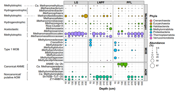 圖2 氣泡圖顯示熱融湖塘(LG 和LNPF)和瀉湖(PFL)中產(chǎn)甲烷古菌(Methanogen),需氧甲烷氧化細菌(MOB)和厭氧甲烷氧化古菌(AOM)的組成特征