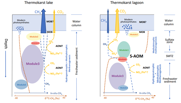圖3 左圖顯示淡水熱融湖泊中甲烷循環(huán)群落和過(guò)程的分層分布,右圖顯示在熱融湖泊變成熱融瀉湖后群落和甲烷周轉途徑的重組特征。 所有模塊都包含嗜氫甲基營(yíng)養型產(chǎn)甲烷菌。 模塊 Module 1 僅存在于瀉湖的富含硫酸鹽的咸水層,由源自海洋的厭氧甲烷氧化古菌( AOM)為核心組分。 模塊 4 的 AOM 是海洋和湖泊過(guò)渡層中常出現的組分。 模塊 2、模塊 3 和模塊 5 在熱融湖塘和瀉湖中均可見(jiàn),由不同類(lèi)型的產(chǎn)甲烷菌、需氧甲烷氧化細菌(MOB) 和厭氧甲烷氧化古菌( AOM) 組成