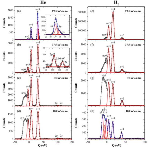 圖:實(shí)驗測量所得19.5 – 100 keV/amu O6+與He,H2電荷交換量子態(tài)選擇分布