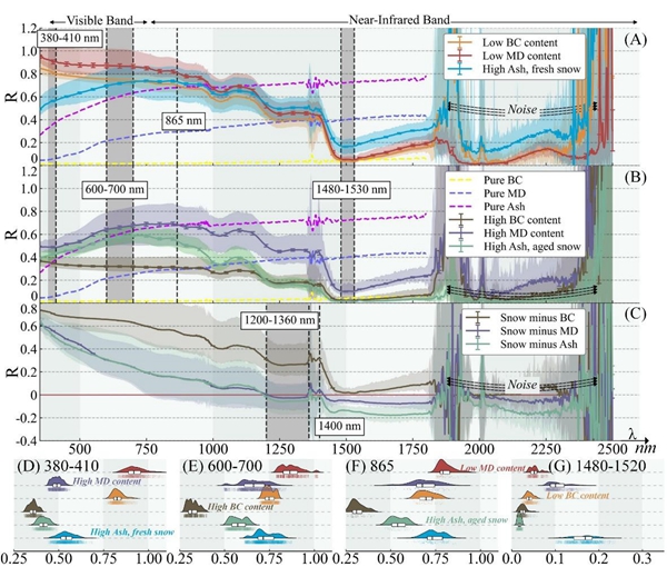 基于上述科學(xué)問(wèn)題,研究團隊在中國典型積雪區,使用多角度光譜測量?jì)x器在人工分布和自然沉積條件下獲得了不同含量黑碳/沙塵/灰分的積雪半球定向反射系數(Hemispherical Directional Reflectance Factor, HDRF)數據集。研究發(fā)現,LAIs引起的積雪反射率擾動(dòng)是非線(xiàn)性減速的,即每ppm LAIs對積雪反射率的削減隨積雪污染的增加而減小。當存在足夠的黑碳時(shí),雪反射率可能會(huì )保持較低水平而不會(huì )迅速下降,黑碳引起的積雪暗化可能在其濃度處于數千ppm時(shí)達到飽和。測量表明,極高的LAIs濃度水平可能會(huì )增加其消光范圍,黑碳可以使整個(gè)測量范圍內(350-2500 nm)的積雪暗化,而沙塵和灰分只能影響到1200 nm之前(350-1200 nm)。含沙塵或灰分的積雪分別在600和700 nm左右出現光譜斜率突變點(diǎn)。大量沙塵或灰分顆粒的沉積可使1400 nm波段以外的積雪反射率增加,沙塵增加0.1,灰分增加0.2。該研究結果促進(jìn)了黑碳、沙塵和灰分對積雪角反射模式影響的全面理解,有助于進(jìn)一步了解吸光雜質(zhì)、模擬臟雪中的反照率以及估算污染物含量。