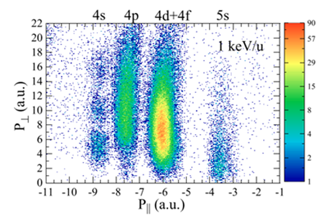 圖:實(shí)驗測量所得1 keV/u Ar8+與He電荷交換反沖離子動(dòng)量關(guān)聯(lián)譜。橫軸為反沖離子縱向動(dòng)量;縱軸為反沖離子橫向動(dòng)量。