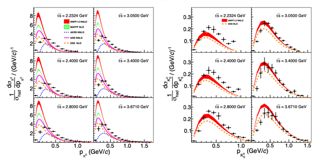 在本項工作中,利用北京譜儀BESIII數據,團隊精確測量了中性pion和Kaon介子單舉產(chǎn)生微分截面,最高精度達4%, 僅為現有實(shí)驗數據誤差的五分之一?;诂F有一系列碎裂函數的理論計算均不能很好地描述實(shí)驗結果。因此,該能區的實(shí)驗測量為碎裂函數及強子化過(guò)程的研究提供了精確的實(shí)驗數據。