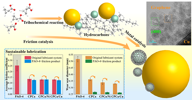 為促使界面間碳基摩擦膜的快速形成,研究人員選取吸附能和表面能較高的活性碳源小分子環(huán)丙甲酸(CPCa)與金屬粒子復合引入基礎油,CPCa在熱催化-力剪切作用下快速發(fā)生脫氫斷鍵向石墨化轉變,生成了含有石墨烯的碳基摩擦膜。同時(shí),石墨化產(chǎn)物促進(jìn)了潤滑體系的可持續潤滑效應,提升了體系的潤滑壽命。相關(guān)成果發(fā)表在A(yíng)CS Sustainable Chemistry & Engineering(2023, 11(6): 2238-2248, DOI: 10.1021/acssuschemeng.2c05639)上,并入選當期補充封面文章(Supplementary Cover Article)。