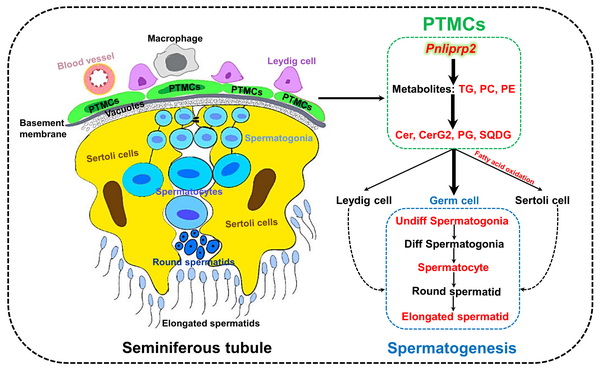 研究模式圖:胰脂肪酶相關(guān)蛋白2基因(Pnliprp2)在小鼠睪丸管周肌樣細胞中特異表達,并在維持精子發(fā)生中發(fā)揮關(guān)鍵作用