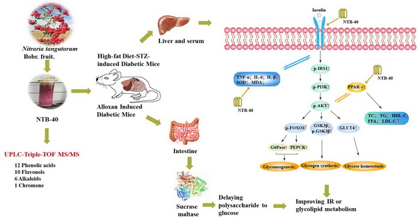 該研究建立了四氧嘧啶誘導的糖尿病小鼠模型,評價(jià)了NTB-40不同劑量(100,200,400 mg/kg)降低糖尿病小鼠餐后血糖的情況。淀粉/蔗糖酶/麥芽糖耐量實(shí)驗證實(shí)NTB-40中高劑量組能夠顯著(zhù)降低糖尿病小鼠餐后血糖。建立高脂飲食-STZ誘導的糖尿病小鼠模型,研究NTB-40長(cháng)期給藥對糖尿病小鼠糖脂代謝和IR的影響。結果顯示NTB-40可以通過(guò)維持葡萄糖穩態(tài)(FBG、OGTT、ITT、FINS和HOMA-IR)和脂質(zhì)穩態(tài)(TC、TG、HDL-C、LDL-C和FFA)從而改善糖脂代謝紊亂和胰島素抵抗,并能減少炎癥(IL-6、IL-1β和TNF-α)和氧化應激(SOD和MDA)反應,減輕肝臟組織損傷。機制研究證實(shí),NTB-40能夠通過(guò)調節IRS1/PI3K/AKT信號通路和下游蛋白FOXO1、GSK3β、GLUT4的表達,從而降低糖異生,促進(jìn)糖原合成和葡萄糖攝取,實(shí)現改善胰島素抵抗的作用效果。