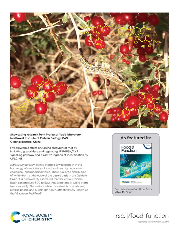 相關(guān)研究結果以Hypoglycemic effect of Nitraria tangutorum fruit by inhibiting glycosidase and regulating IRS1/PI3K/AKT signalling pathway and its active ingredients identification by UPLC-MS為題,于08月30日在Food Function上(一區Top期刊)以封面文章的形式在線(xiàn)發(fā)表。西北高原所蔣思絨博士為第一作者,岳會(huì )蘭研究員為通訊作者。該工作得到了國家自然科學(xué)基金(31900298)、西部之光等項目的資助和支持。同時(shí)感謝梅麗娟研究員提供的白刺封面圖片。