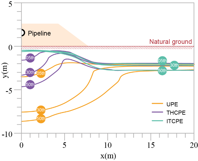 基于上述科學(xué)問(wèn)題,中國科學(xué)院西北生態(tài)環(huán)境資源研究院科研團隊研究提出一種新型倒T型碎石管道路堤(ITCPE)結構,該結構基于“煙囪效應”原理,利用管道自身熱量強化對流,可更有效地帶走管道熱量,冷卻凍土。此外,基于現場(chǎng)監測系統的實(shí)測邊界,結合多孔介質(zhì)及相變理論,對ITCPE、無(wú)保護管道路堤(UPE)和傳統水平碎石管道路堤(THCPE)結構在長(cháng)期運行過(guò)程中的熱效應進(jìn)行了長(cháng)期數值預測。研究結果表明,無(wú)論是有保溫層的埋地管道結構、無(wú)防護的管堤結構,還是傳統的水平碎石管堤結構,都無(wú)法很好地解決中俄原油管線(xiàn)融沉問(wèn)題。但新型ITCPE結構可以有效減緩管道融沉問(wèn)題,而且在管道運營(yíng)50年內可顯著(zhù)維持管堤下伏凍土的人為凍土上限高度。相關(guān)研究結果為中俄原油管線(xiàn)提供了技術(shù)支持,同時(shí)也為全球多年凍土區其他管道工程的設計和維護提供科學(xué)參考。