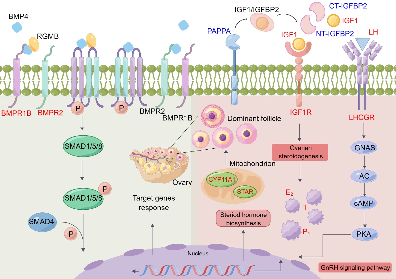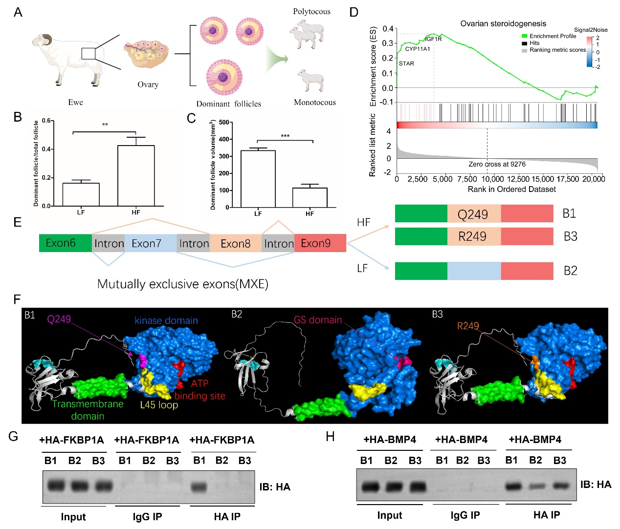 中國科學(xué)院西北高原生物研究所動(dòng)物生態(tài)與資源保護研究團隊針對綿羊重要繁殖性狀(產(chǎn)羔數和產(chǎn)羔間隔),以連續三個(gè)產(chǎn)羔季節產(chǎn)多胎(每胎產(chǎn)兩羔或三羔,HF)和產(chǎn)單胎(每胎產(chǎn)一羔,LF)的藏羊為研究對象,整合全基因組關(guān)聯(lián)分析、普通轉錄組學(xué)、單細胞轉錄組學(xué)、蛋白質(zhì)組學(xué)和代謝組學(xué)等多組學(xué)研究方法,結合KASP基因分型、實(shí)時(shí)熒光定量PCR、酶聯(lián)免疫吸附實(shí)驗、免疫共沉淀和蛋白質(zhì)免疫印跡等分子功能驗證實(shí)驗,挖掘藏羊產(chǎn)羔數和產(chǎn)羔間隔關(guān)鍵調控元件并揭示其高繁殖力的遺傳調控機制。全基因組關(guān)聯(lián)研究表明,BMPR1B基因與產(chǎn)羔數性狀相關(guān),PAPPA基因與產(chǎn)羔間隔性狀相關(guān)。首次構建了藏羊卵巢單細胞圖譜,發(fā)現關(guān)鍵基因PAPPA特異性表達在壁層顆粒細胞亞群,且BMPR1B基因在壁層顆粒細胞和固醇生成顆粒亞群高表達?;趩渭毎D錄組學(xué)、蛋白質(zhì)組學(xué)和代謝組學(xué)整合分析,發(fā)現PAPPA是刺激卵巢優(yōu)勢卵泡生長(cháng)發(fā)育和類(lèi)固醇生成的關(guān)鍵候選基因。繁殖主效基因BMPR1B除了非同義突變,首次在藏羊中發(fā)現BMPR1B還存在可變剪接事件調控多胎性狀。該研究結果對分子精準選育提升藏羊繁殖力和實(shí)現藏羊產(chǎn)業(yè)提質(zhì)增效具有重要意義。