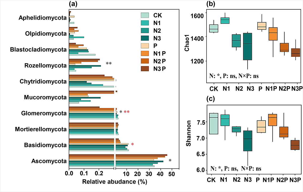 圖1 氮和磷添加對優(yōu)勢真菌類(lèi)群相對豐度 (a)、真菌 Chao1 豐富度 (b) 和真菌Shannon多樣性 (c) 的影響。 (a)中的黑色和紅色*分別表示氮添加和磷添加的影響。 (b,c) 中的 N、P 和 N × P 顯示了氮添加和磷添加及其交互作用對真菌群落多樣性的影響。