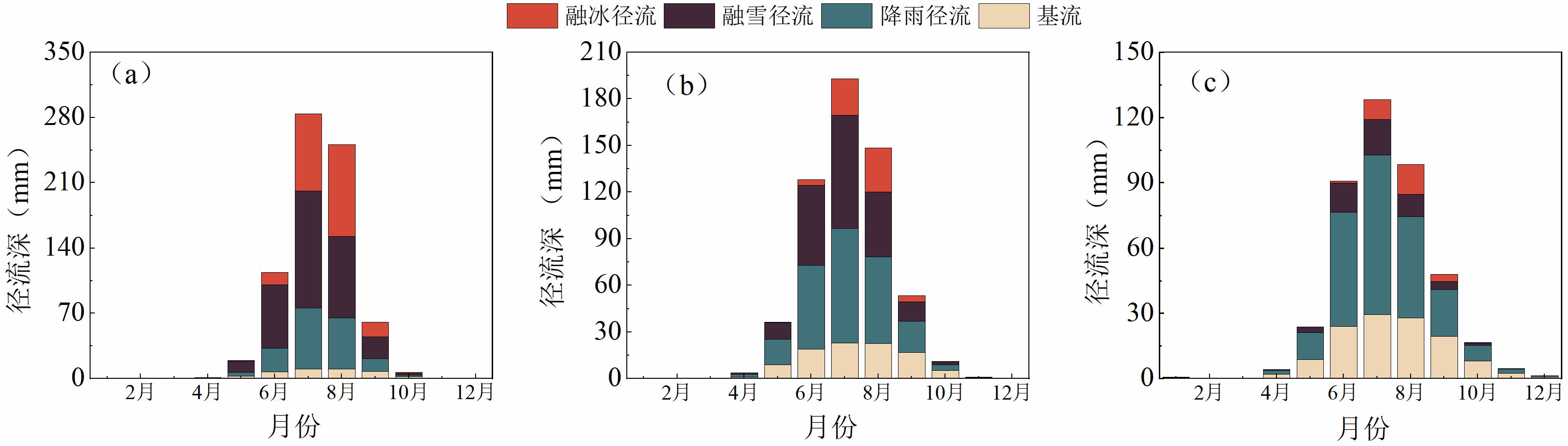 圖2 烏源1號冰川(a)、總控(b)和后峽(c)子流域徑流組分的月變化趨勢