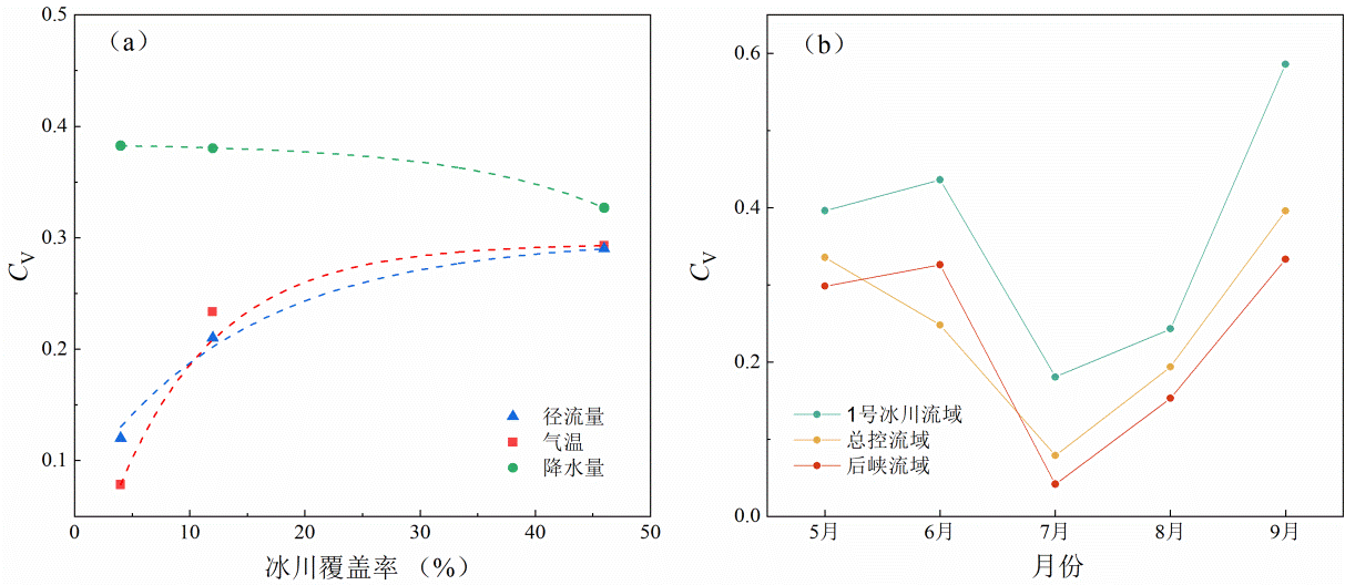 (3)三個(gè)子流域融冰徑流和冰川徑流的貢獻率與冰川覆蓋率呈線(xiàn)性關(guān)系,與前人在阿爾卑斯山38個(gè)冰川覆蓋流域研究得到的對數關(guān)系有所不同,主要是烏河流域冰川在夏季強烈消融所致(圖3)。三個(gè)子流域的徑流變差系數(CV)分別為0.29、0.21和0.12,隨著(zhù)冰川覆蓋率的降低而減小,這主要與流域徑流組成、下墊面特征等因素有關(guān)(圖4)。