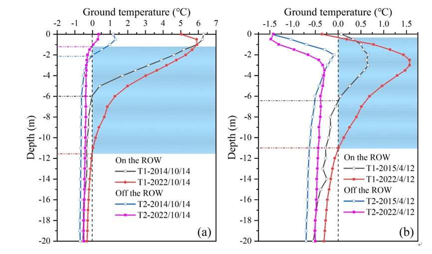 研究表明,管周多年凍土迅速退化,距離管道一線(xiàn)2米處的年最大融化深度以每年0.68 m的速度下降,至2022年融化深度已達到11.4m,融區水平方向約51m。管道一線(xiàn)、二線(xiàn)周?chē)娜趨^在不斷擴張并呈現逐漸貫通的趨勢。凍土融化引起的管道下沉和地表差異性融沉導致了熱融洼地和積水、冰椎的規律性分布。