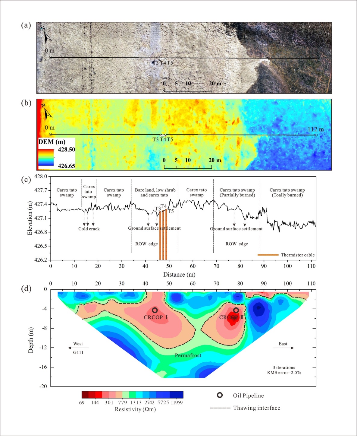 西北研究院科研團隊利用中俄原油管道沿線(xiàn)典型場(chǎng)地的油溫、地溫、管道位移、地表形變、物探(ERT)和無(wú)人機影像數據,分析了管道周?chē)嗄陜鐾寥诨?、地表變形、植被變化、積水和冰椎分布等,并對多年凍土融化與地表形變之間的協(xié)變性進(jìn)行了系統研究。