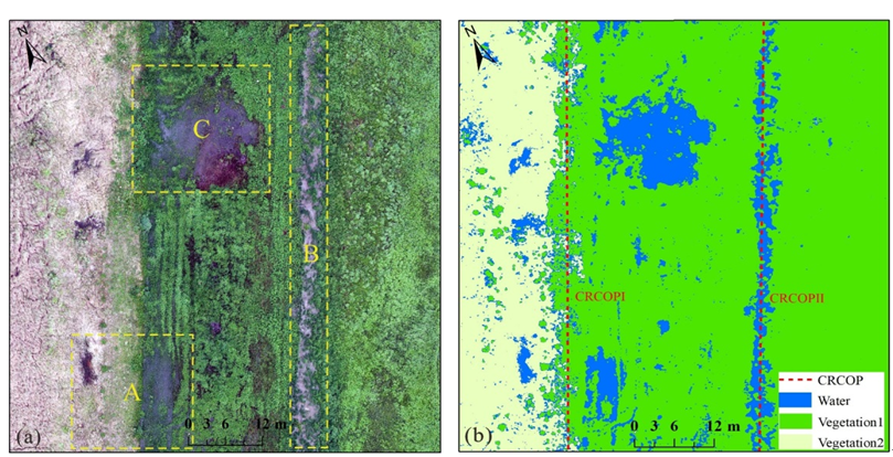 圖3 管道沿線(xiàn)積水分布?。╝)無(wú)人機正射影像?。╞)影像監督分類(lèi)結果