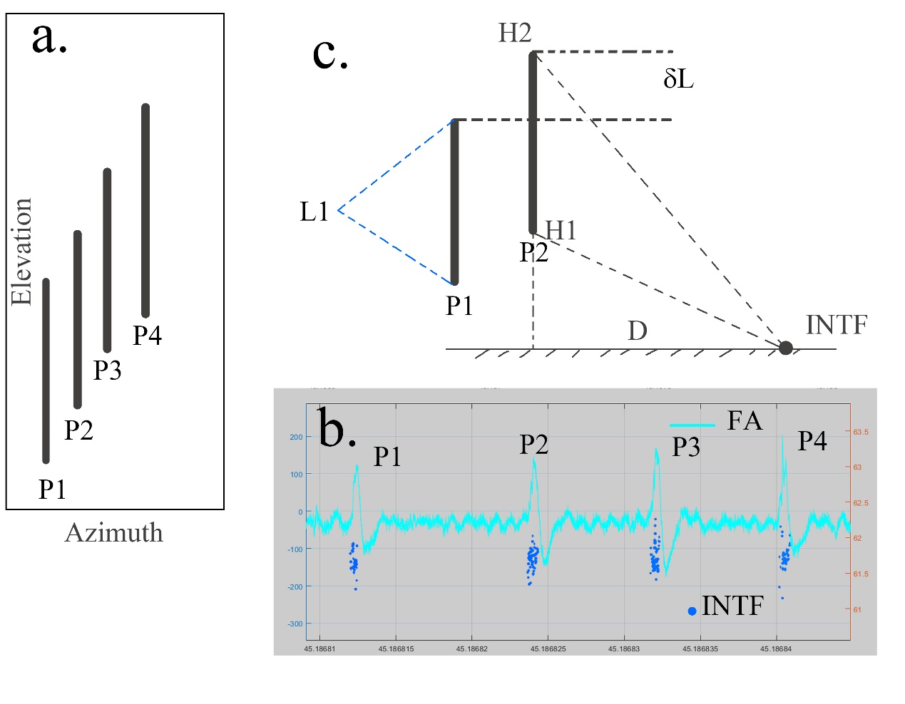 圖2. VHF干涉儀(Fan et al.,2023a;2023b)對規則脈沖爆發(fā)序列中連續脈沖的二維觀(guān)測結果,顯示這些脈沖比正常的直竄先導速度更快,并且從一個(gè)脈沖到另一個(gè)脈沖之間重疊較強?。╝)。從平面距離 D?。健?.8 公里和干涉儀仰角的差異(例如,60.5° 和 60°),可以得出脈沖的 VHF輻射源的垂直范圍約為 205 米?。╟)。這一現象發(fā)生在約 2 微秒的時(shí)間間隔內,對應的速度約為 108 米/秒。脈沖代表的擊穿速度遠高于已知的閃電先導通道發(fā)展速度。
