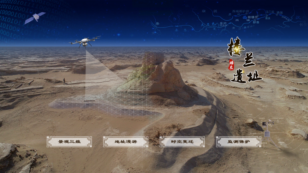 系統平臺通過(guò)“景觀(guān)三維、遺址漫游、時(shí)空變遷、監測保護”四個(gè)功能模塊,實(shí)現了衛星宏觀(guān)遙感、無(wú)人機精細測繪、地面實(shí)時(shí)監測等綜合技術(shù)在樓蘭遺址的協(xié)同應用。能夠通過(guò)精細二三維實(shí)景地圖模型客觀(guān)真實(shí)、身臨其境地展示遠在千里之外的神秘古城;通過(guò)歷史地圖和衛星遙感數據的空間一體化,提供了一套研究樓蘭古跡時(shí)空演變的空間數據庫;利用衛星、無(wú)人機和地面傳感器技術(shù),實(shí)現了“天空地”一體化的樓蘭遺址生態(tài)環(huán)境因子系統監測與分析。