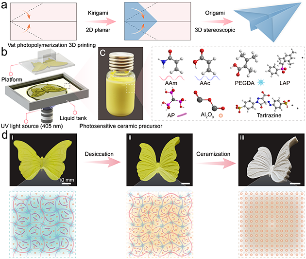 該團隊受折紙/剪紙藝術(shù)啟發(fā),以水性無(wú)機粘結劑磷酸二氫鋁(AP)溶膠為水凝膠單體分散介質(zhì),將水凝膠單體和納米陶瓷粉體混合來(lái)制備光敏性水凝膠陶瓷漿料;利用光固化3D打印獲得具有優(yōu)異的延展性、形狀適應性、抗疲勞性且可二次變形的水凝膠柔性骨架;依次經(jīng)過(guò)脫水干燥、低溫脫脂和高溫燒結等步驟,實(shí)現了具有超低收縮、高陶瓷產(chǎn)率和形狀保真度的懸空大跨度陶瓷結構(圖1)。設計的柔性水凝膠基陶瓷前驅體能夠實(shí)現從平面形狀到3D立體結構的轉變,突破了傳統硬質(zhì)/脆性陶瓷前驅體來(lái)制造復雜陶瓷結構的局限。