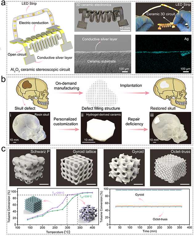 基于此方法,研究人員還可制造無(wú)支撐且大跨度的陶瓷三維電路,且這種陶瓷三維電路能很好地點(diǎn)亮LED燈帶。此外,利用水凝膠柔性骨架的可變形性,可按需或個(gè)性化制造具有顱骨缺損形狀的陶瓷結構來(lái)實(shí)現骨缺陷部位修復。制造的陶瓷結構還可結合表面改性策略創(chuàng )造性設計制備高性能的復雜結構催化陶瓷器件,具有優(yōu)良的催化活性和穩定性。研究人員還進(jìn)一步拓展了這種方法在三維電路、生物醫用及功能催化領(lǐng)域的潛在應用(圖3)。