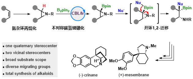 近日,該團隊針對簡(jiǎn)單烯烴不對稱(chēng)多官能團化存在的問(wèn)題,利用其發(fā)展的CBL/銥催化體系,結合烯烴的氮雜環(huán)丙烷化/開(kāi)環(huán)1,2-遷移硼化的組合策略,實(shí)現了簡(jiǎn)單烯烴的不對稱(chēng)三官能團化反應,高對映選擇性地實(shí)現了鄰位季碳中心的手性胺。同時(shí),利用該方法,團隊首次實(shí)現了從廉價(jià)易得的環(huán)己烯到石蒜科生物堿(-)-crinane和(+)-mesembrane的對映選擇性全合成。