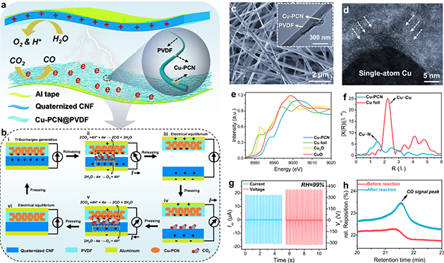 近日,研究團隊與新加坡科學(xué)技術(shù)研究局的科研人員合作,在界面電荷利用方面做出新突破,利用單原子銅錨定的聚合物碳氮化物催化劑和季銨化纖維素納米纖維成功實(shí)現了接觸電催化CO2還原,生成CO的法拉第效率達到96.24?。?/span>。季銨化纖維素納米纖維由于含豐富的羥基,可在高濕度環(huán)境中與水分子形成氫鍵,固定水分子并參與接觸帶電并發(fā)生氧化反應,導致氧氣和質(zhì)子的產(chǎn)生,參與觸電催化CO2還原過(guò)程。這種方法在低濃度CO2環(huán)境中能高效地將其轉化為CO,為減少大氣CO2排放和推進(jìn)化學(xué)可持續性策略提供了一種解決方案。