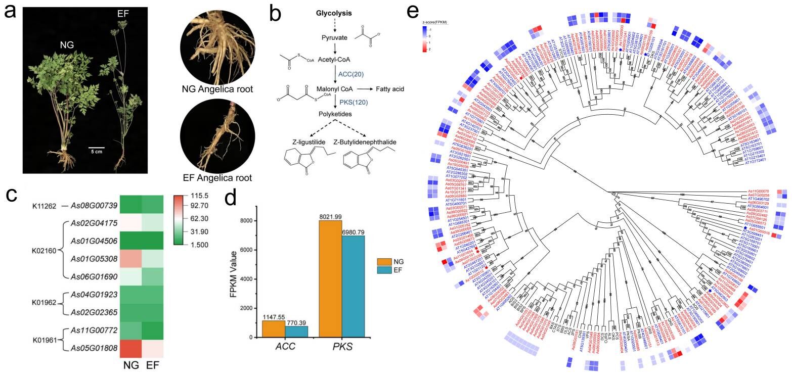 圖 苯酞類(lèi)物質(zhì)的合成與調控 a.正常生長(cháng)當歸(NG)和早花當歸(EF) b.丙二酰輔酶A的合成代謝途徑 c.正常當歸和早花當歸根中ACC基因的表達量熱圖 d. 正常當歸和早花當歸根中ACC基因和PKS基因的表達量值(FPKM)e.當歸中PKS基因的進(jìn)化樹(shù),及其在正常當歸和早花當歸中根的表達量熱圖。