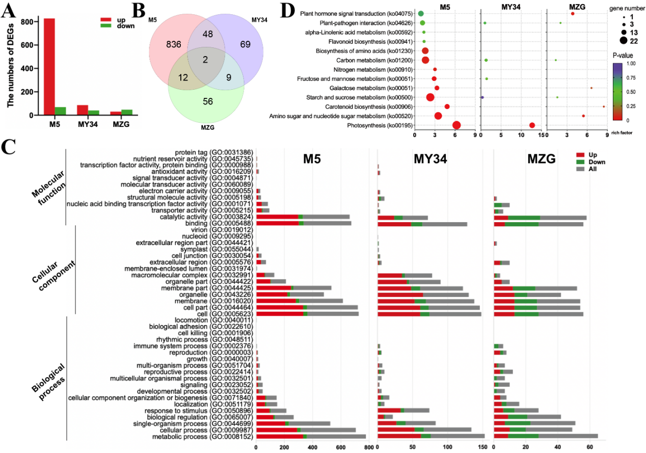 研究表明,相較于不施用菌劑,施用等量菌劑的兩種方式——MZG和M5顯著(zhù)促進(jìn)了馬鈴薯塊莖的生物量,且M5誘導光合作用、糖代謝和苯丙素生物合成在轉錄水平的上調表達。