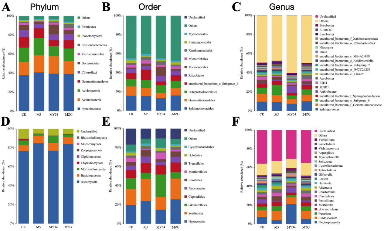 此外,根際微生物組結果表明,三種施用方式均不顯著(zhù)改變微生物群落結構,但M5和MZG土壤中更易富集有益微生物,如青霉菌;而MY34更易富集嗜糖微生物,如Arthrobacter屬細菌和Plectosphaerella、Mortierella屬真菌。