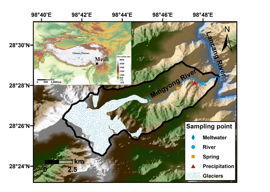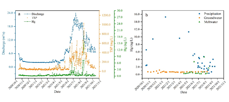 中國科學(xué)院西北生態(tài)環(huán)境資源研究院冰凍圈科學(xué)與凍土工程重點(diǎn)實(shí)驗室科研團隊,聯(lián)合中國科學(xué)院地質(zhì)與地球物理研究所、浙江師范大學(xué)、云南大學(xué)等多家單位,依托云南麗江玉龍雪山冰凍圈與可持續發(fā)展國家野外科學(xué)觀(guān)測研究站“一站四區”觀(guān)測網(wǎng),在梅里雪山明永河流域開(kāi)展了為期一年的日尺度觀(guān)測,剖析冰川徑流中總汞濃度的變化規律及控制因素,量化汞的輸入通量,并評估明永河流域以及整個(gè)青藏高原冰川徑流中總汞的輸出通量。