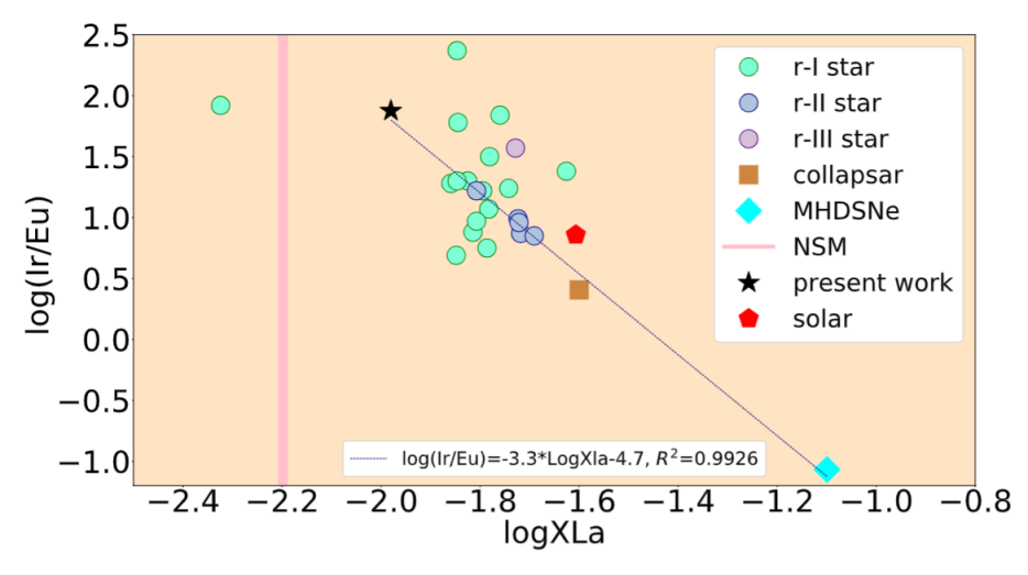 研究人員發(fā)現CEJSNe是目前最強的超鑭元素合成地點(diǎn)。在提取了被標定為r-過(guò)程增強星的天文觀(guān)測量及相關(guān)理論模型值后,研究發(fā)現 CEJSNe與其它理論模型呈現出很好的反關(guān)聯(lián)關(guān)系。這表明,豐富的稀土元素和超鑭元素不能同時(shí)出現在同一次r-過(guò)程核合成中。研究同時(shí)指出,如果沒(méi)有CEJSNe,r-過(guò)程增強星的觀(guān)測值將很難被理論模型解釋?zhuān)虼?span style="margin-top: 12px; margin-bottom: 12px; line-height: 1.5em; font-family: arial, helvetica, sans-serif; font-size: 16px;" data-index="9">該研究進(jìn)一步提升了r-過(guò)程核合成理論的完備性。