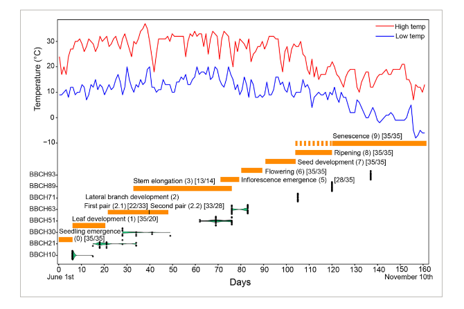 生長(cháng)發(fā)育階段及其標志性發(fā)育事件的確認是開(kāi)展遺傳學(xué)研究、建立表型變異和遺傳控制基因之間因果關(guān)系的重要前提條件?;趪HBBCH編碼系統,課題組定義了9個(gè)沙蓬生長(cháng)發(fā)育階段,涵蓋了整個(gè)生活史,明確了標志性發(fā)育事件,建立了沙蓬BBCH編碼系統。通過(guò)大田實(shí)驗,驗證了該編碼系統的可行性,量化了各個(gè)主要階段及其次級細分階段的時(shí)間持續范圍,為開(kāi)展沙蓬種質(zhì)資源評價(jià)、分子遺傳學(xué)研究和遺傳馴化建立了生長(cháng)發(fā)育時(shí)期轉換的表型參考標準。
