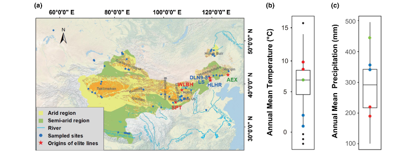 圖4??沙蓬采樣點(diǎn)的地理分布和當地氣候條件以及選育株系的起源地
