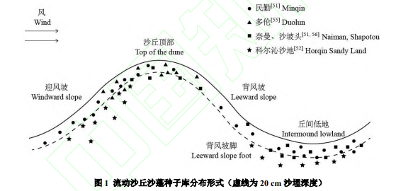 圖5??流動(dòng)沙丘沙蓬種子庫分布形式(虛線(xiàn)為 20 cm 沙埋深度)?