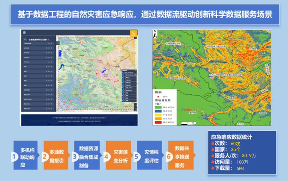 西北研究院國家冰川凍土沙漠科學(xué)數據中心和空天院國家對地觀(guān)測科學(xué)數據中心聯(lián)合國家地震科學(xué)數據中心、地面衛星應用中心、中科星圖、甘肅省科學(xué)數據中心、三和數碼等20多家機構,為解決國內外地震、洪澇、滑坡等災害應急響應處置中存在的災情快速分析能力不足、精準預測預警難等問(wèn)題,構建了跨部門(mén)數據聯(lián)動(dòng)共享機制,創(chuàng )建了數據工程災害應急響應服務(wù)平臺,實(shí)現了多源數據接入、確權、治理、流通、聚合和應用,提升了災害應急處置速度和能力。