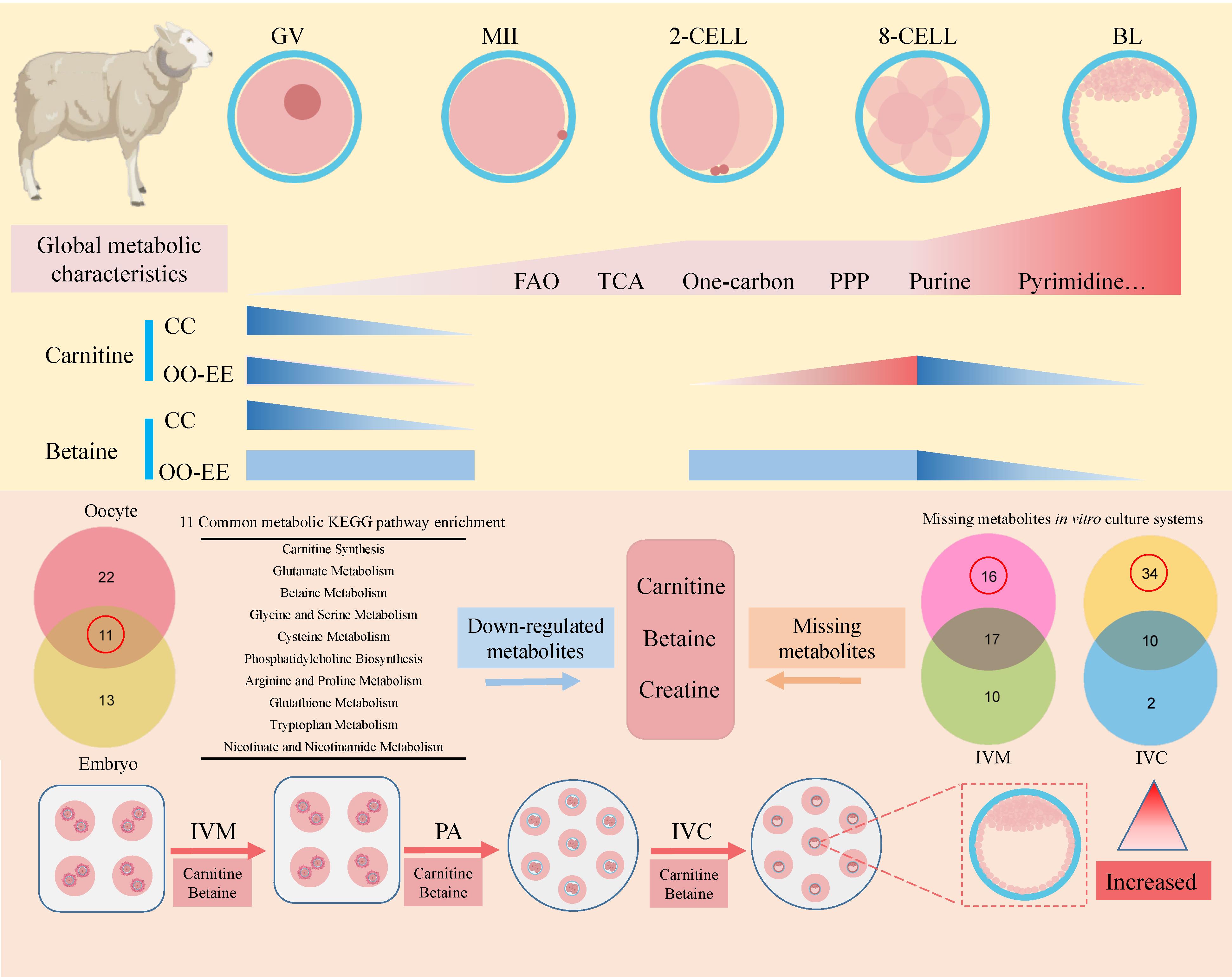 中國科學(xué)院西北高原生物研究所動(dòng)物生態(tài)與資源保護研究團隊與四川農業(yè)大學(xué)動(dòng)物科技學(xué)院團隊合作,通過(guò)利用超靈敏微量代謝組學(xué)技術(shù)和單細胞轉錄組學(xué)技術(shù),對綿羊卵母細胞體外成熟及早期胚胎體外發(fā)育的代謝特征進(jìn)行了解析,發(fā)現:從GV期卵母細胞至2-細胞胚胎階段整體代謝水平呈上升趨勢,為促進(jìn)卵母細胞成熟和合子發(fā)育提供了必要的代謝底物;而在2-細胞胚胎至8細胞胚胎階段,整體代謝表現出安靜狀態(tài),有助于減少氧化應激對細胞的損傷;在8-細胞胚胎至囊胚階段,整體代謝水平又明顯增加,為早期囊胚的形成、增殖分化以及表觀(guān)修飾過(guò)程提供能量和所需的代謝底物。同時(shí),鑒定出肉毒堿、甜菜堿和肌酸為該體外培養系統所缺失的關(guān)鍵代謝物。進(jìn)一步研究發(fā)現,肉毒堿可促進(jìn)綿羊卵母細胞脂肪酸氧化,并降低脂質(zhì)含量和脂質(zhì)過(guò)氧化水平,同時(shí)還可以調節紡錘體形態(tài)。而甜菜堿則具有調節綿羊早期胚胎發(fā)育過(guò)程中滲透壓應激和甲基化修飾的作用。當聯(lián)合肉毒堿與甜菜堿添加至體外培養體系時(shí),顯著(zhù)提高了綿羊卵母細胞的囊胚發(fā)育率。該研究結果為提高卵母細胞成熟和胚胎培養提供了新的視角。